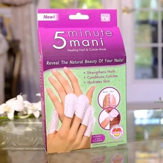 Маска для ногтей 5 minute mani - моментальная маска для ногтей и кутикулы . Маска заменяет пилинг кожи ногтей , а так же предотвращает растрескивание ногтевой пластины . Маска для ногтей укрепляет и увлажняет ногти . Помимо этого ногти приобретают красивый , ухоженный вид . Для того , что бы воспользоваться маской , нужно всего лишь поместить каждый пальчик в напальчник , подождать 5 минут и все !