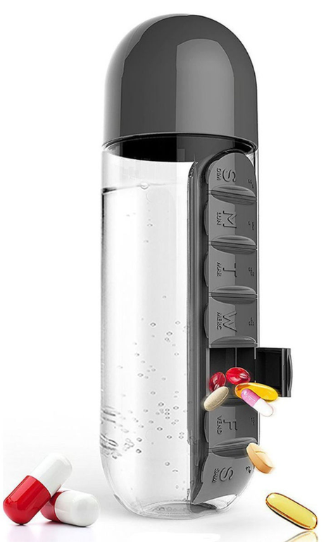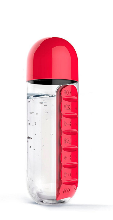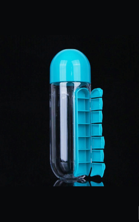 Бутылка для воды, бутылка спортивная, бутылочка для воды, бутылка для бега, фитнес бутылка, бутылка в дорогу это прекрасное и удобное сочетание ежедневного органайзера для таблеток с бутылкой для воды. В бутылку вы можете налить до 600 мл любого напитка, а также во встроенном органайзере разместить лекарства или витамины на неделю. Бутылка-органайзер с таблетницей подойдет и тем кто ведет активный образ жизни, и тем кто нуждается в ежедневном приеме лекарств, и путешественникам. Бутылка для воды с органайзером изготовлена из прочного пищевого пластика с плотно прилегающей крышкой, которую можно поставить и использовать как стакан. Органайзер для таблеток с бутылки снимается,можно хранить отдельно в сумочке. Бутылка органайзер будет удобно для всех поколений, она будет замечательным дополнением к подарку как женщинам так и мужчинам. Таблетница, органайзер для таблеток, бутылка со стаканчиком.