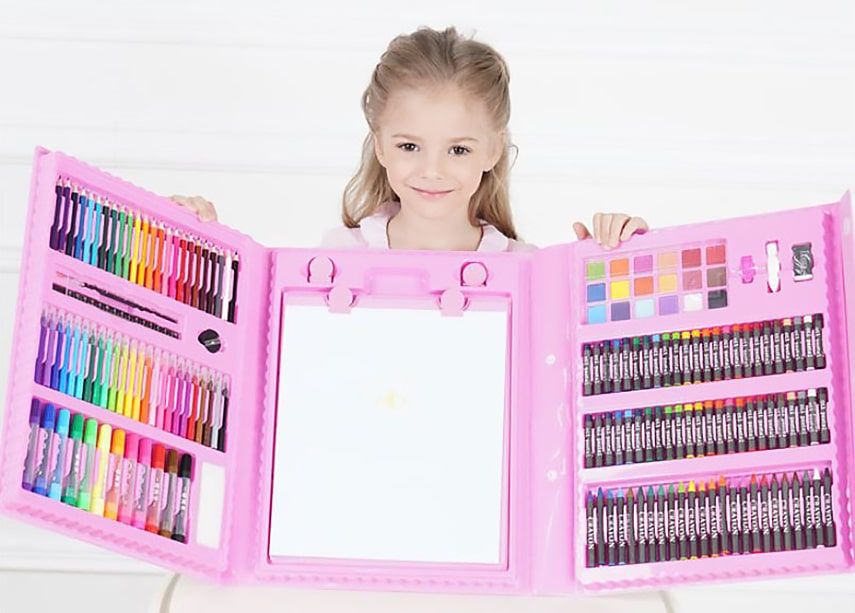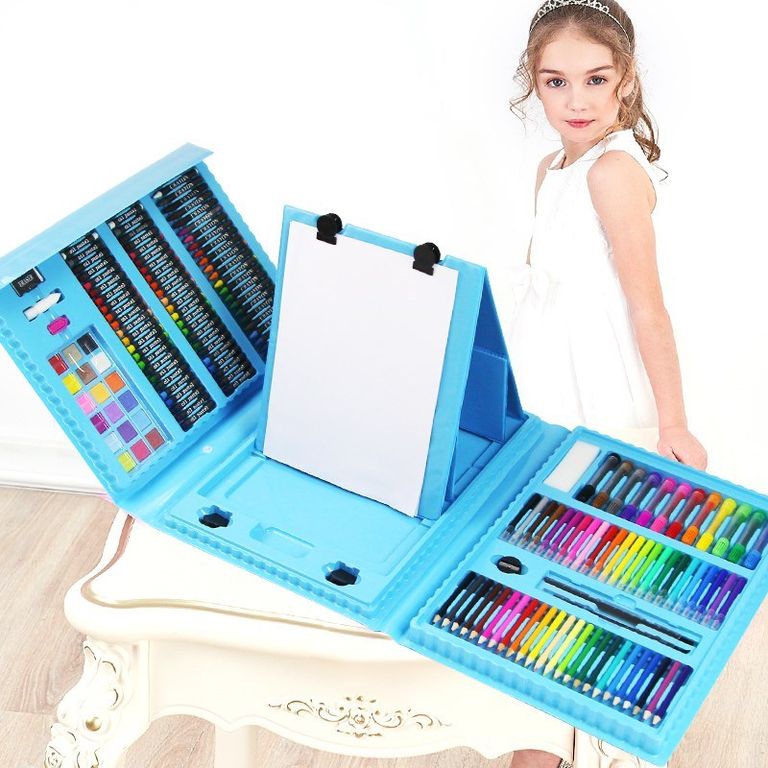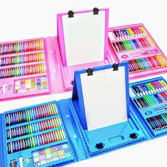 Набор для рисования с мольбертом в подарочной упаковке состоит из 208 предметов. В нем находится все, что нужно для развития художественных способностей ребенка! Все предметы аккуратно расположены в одной папке, имеющей ручку для переноски.