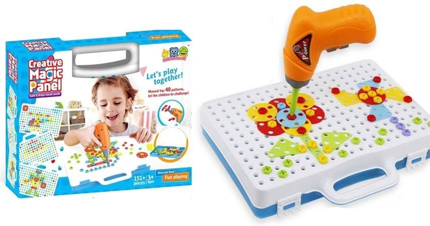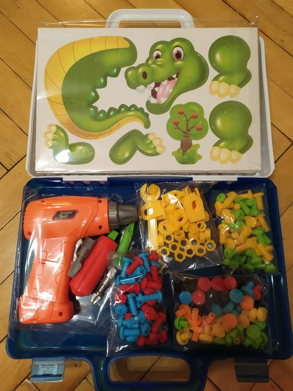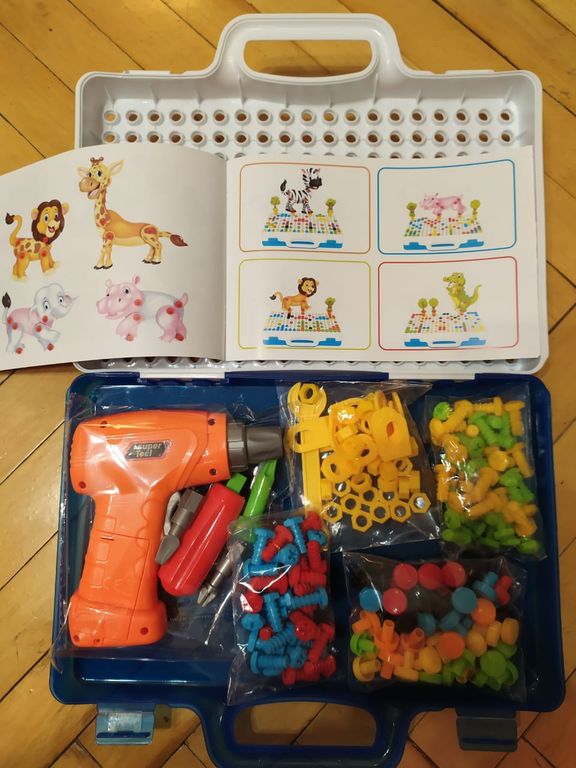 Все детали пазла и вспомогательные инструменты аккуратно складываются в чемоданчик. Его перфорированная задняя часть выступает в качестве основы для конструкций. Мозаика позволяет развивать, тренировать и поддерживать моторику пальцев, стимулирует воображение, развивает сенсорику. С помощью разноцветных шурупов ребенок может создавать небольшие, красочные картины. Для помощи с игрой есть инструкция, которая подскажет, как лучше начать собирать конструкции. Родителям нужно будет показать малышу принцип сборки мозаики, а дальше ребенок сможет создавать что-то самостоятельно.