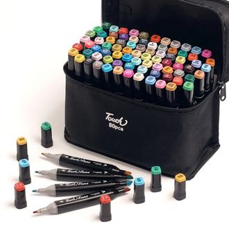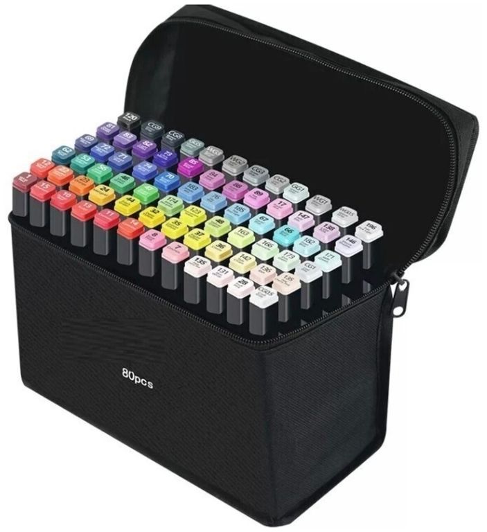 Набор профессиональных двусторонних маркеров для скетчинга 80 цветов в чехле. Маркеры двусторонние: одна сторона классической формы, вторая - скошенная. Ширина стержня 1мм и 6мм соответсвенно. Чернила на спиртовой основе нетоксичны и не портят поверхность бумаги в отличие от маркеров на водной основе. Скетчи данными маркерами быстро высыхают на бумаге и становятся водостойкими, бескислотными. Маркеры подходят для использования на бумаге, картоне, фотографиях, ксерокопиях, пластике, дереве, ткани, холсте.