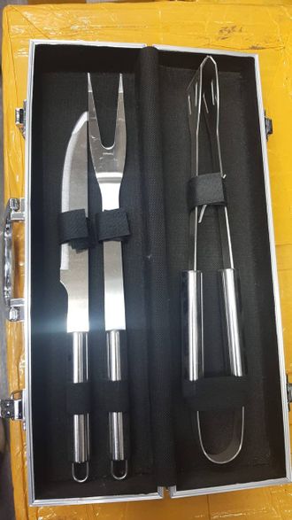 Компактный набор для барбекю, гриля, шашлыка в подарочном кейсе. В наборе для барбекю есть все самое основное: щипцы, большая вилка, лопатка, удобный кейс-сумка. Все инструменты в наборе изготовлены из высококачественной нержавеющей стали, подходят для длительного использования. Данное изделие поможет Вам приятно и комфортно провести свой отдых на природе. Набор для барбекю станет отличным подарочным набором в любой праздник.