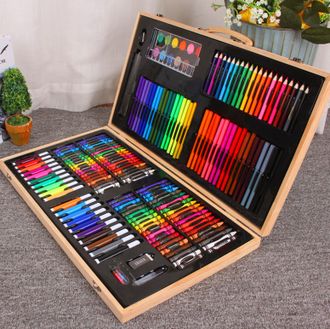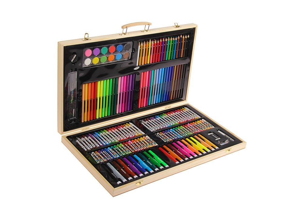 Набор художника 220 предметов - универсальный набор для рисования, в чемоданчике есть все для юных художников: фломастеры, карандаши, мелки, краски, различные канцелярские товары, и все это упаковоно в деревянный стильный чемоданчик.