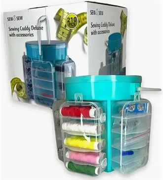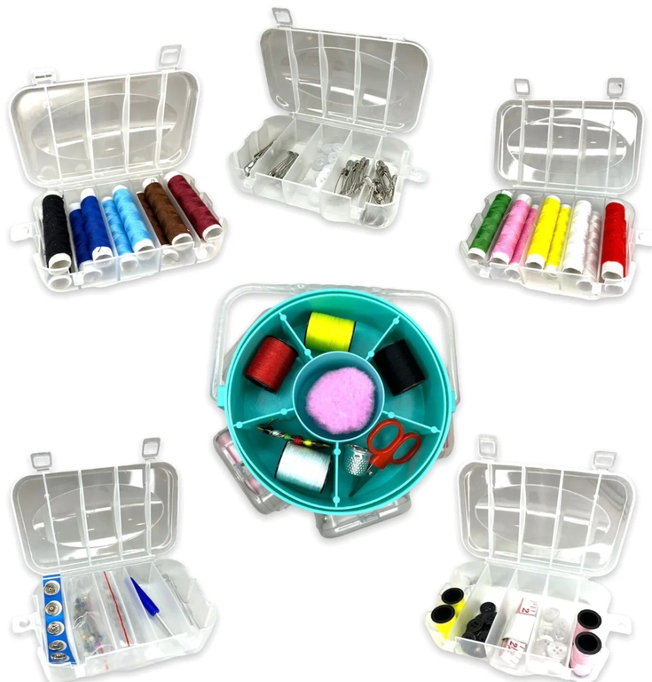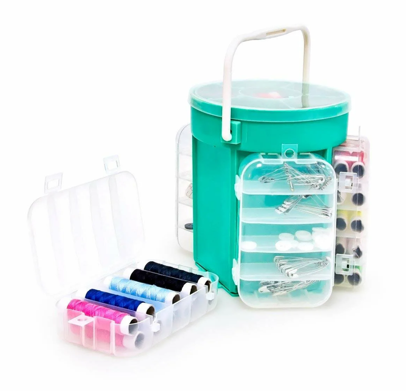 Набор для ручного и швейного шитья представляет собой вместительный контейнер из пластика со съемными полочками. В нем удобно и с пользой можно разместить нужные аксессуары, такие как нити, пуговицы, кнопки, мелки, булавки, иглы и подушечки для игл, сантиметровую ленту.