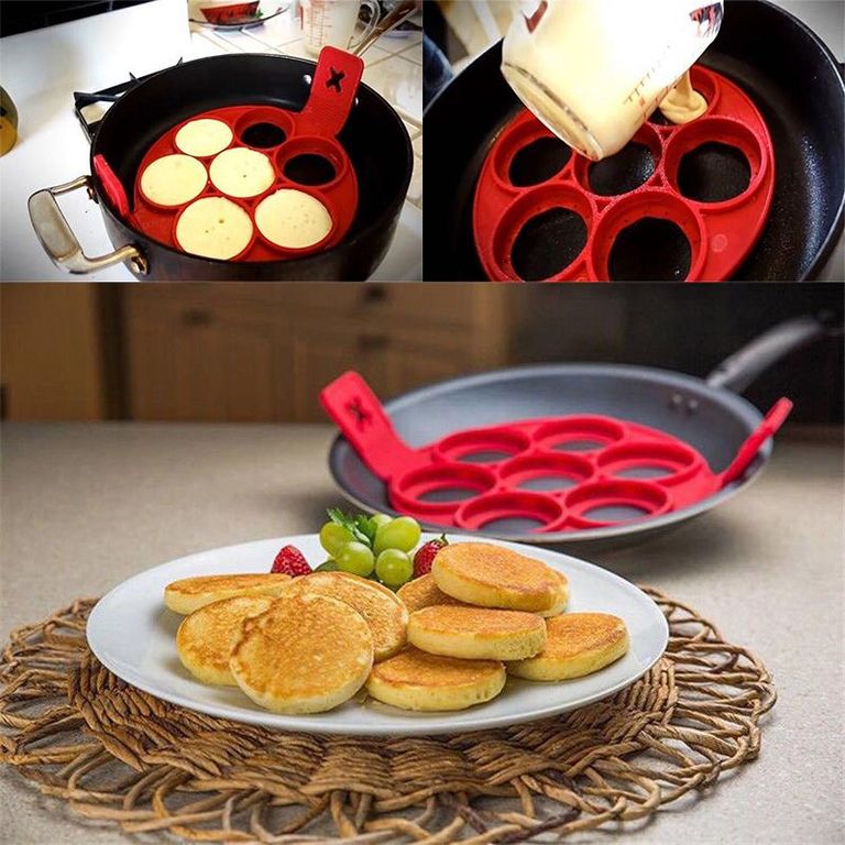 Весь секрет приспособления заключается в том, что для его изготовления был использован абсолютно безвредный пищевой силикон, который выдерживает высокие температуры. Силиконовая форма для оладий имеет 7 углублений. Плоское силиконовое кольцо в каждом углублении удерживает оладьи во время переворачивания. Поэтому приготовление оладий теперь станет быстрым и приятным!