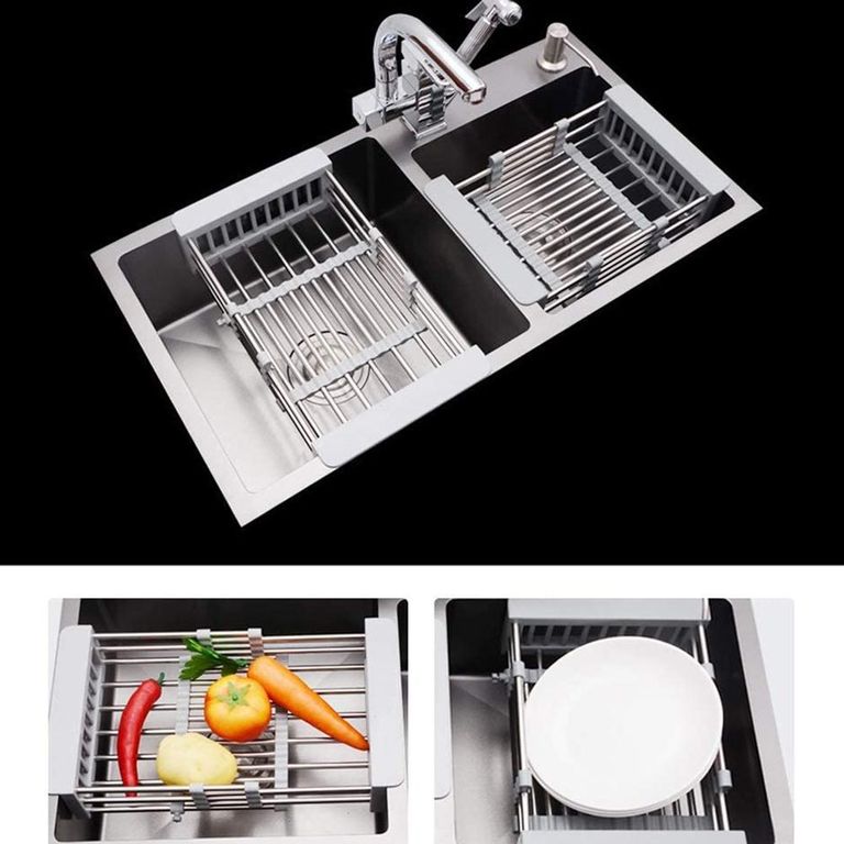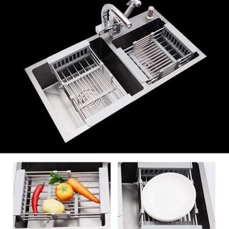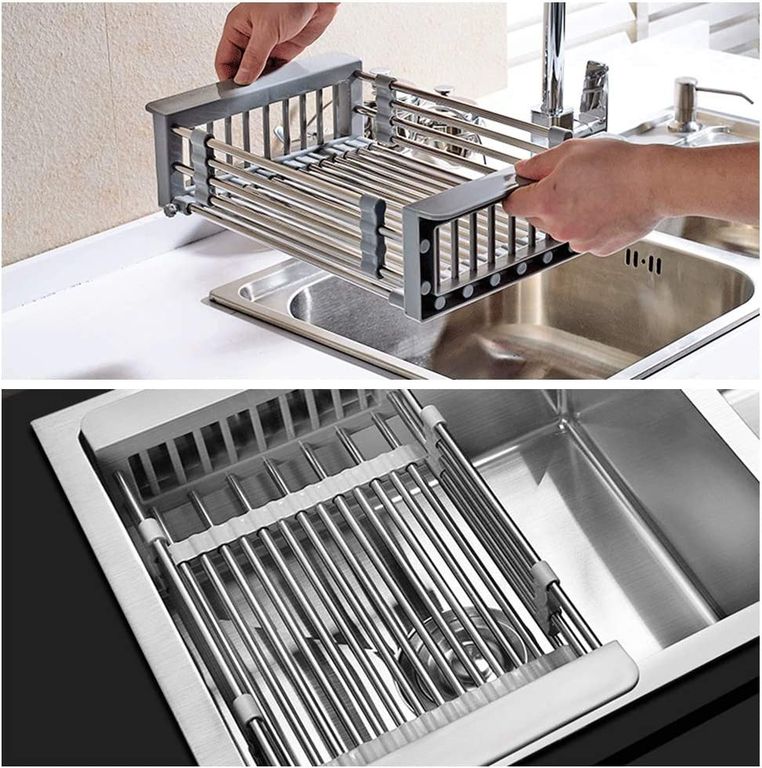 Конструкция сушилки очень прочная. Чтобы воспользоваться ей, раздвиньте сушилку по ширине вашей раковины и установите ее так, чтобы бортики сушилки опирались на края раковины. Вместительная чаша сетки подходит для одновременного мытья большого количества овощей или фруктов.